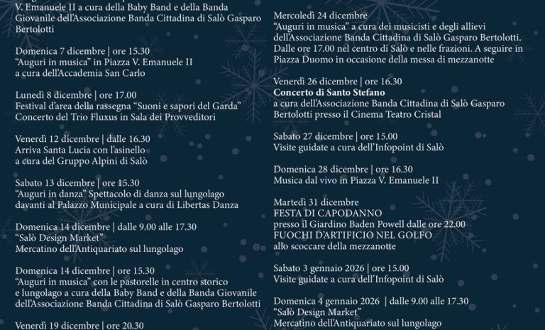 📅 QUANDO: 05/12/2025 – 10/01/2026 📍 DOVE: Salò, Lungolago Zanardelli 52 (Vedi su Mappa) 💰 INGRESSO: Vedi Info 🏢 ORGANIZZAZIONE: Comune di Salò