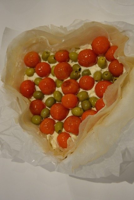 Versare la ricotta sopra la pasta fillo e farcire con i pomodorini e le olive.