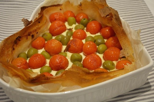 Ecco una ricettina veloce e facile da gustare in compagnia! Torta salata con pasta fillo pomodorini e olive verdi